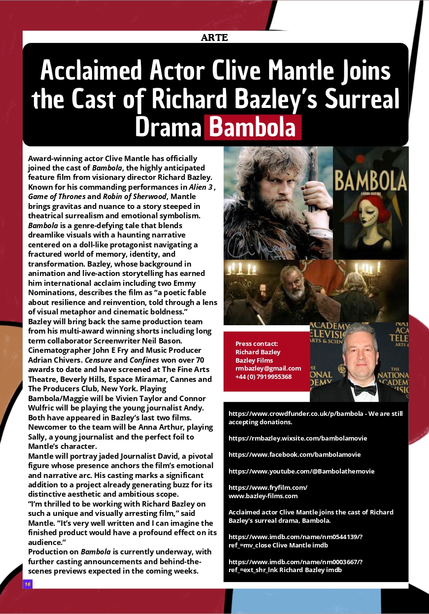 Award-winning actor Clive Mantle has officially joined the cast of Bambola, the highly anticipated feature film from visionary director Richard Bazley. Known for his commanding performances in Alien 3, Game of Thrones and Robin of Sherwood, Mantle brings gravitas and nuance to a story steeped in theatrical surrealism and emotional symbolism.