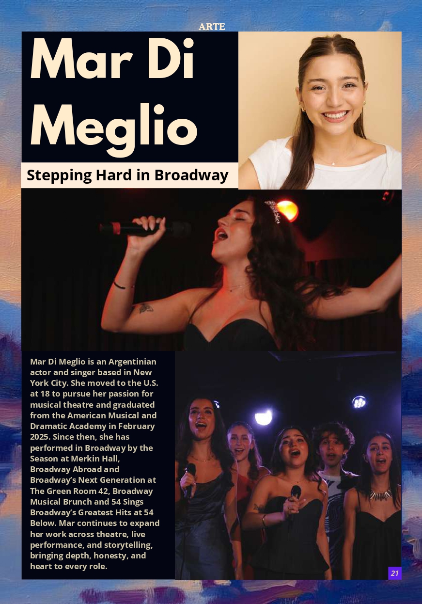 Mar Di Meglio is an Argentinian actor and singer based in New York City. She moved to the U.S. at 18 to pursue her passion for musical theatre and graduated from the American Musical and Dramatic Academy in February 2025. Since then, she has performed in Broadway by the Season at Merkin Hall, Broadway Abroad and Broadway’s Next Generation at The Green Room 42, Broadway Musical Brunch and 54 Sings Broadway’s Greatest Hits at 54 Below. Mar continues to expand her work across theatre, live performance, and storytelling, bringing depth, honesty, and heart to every role.