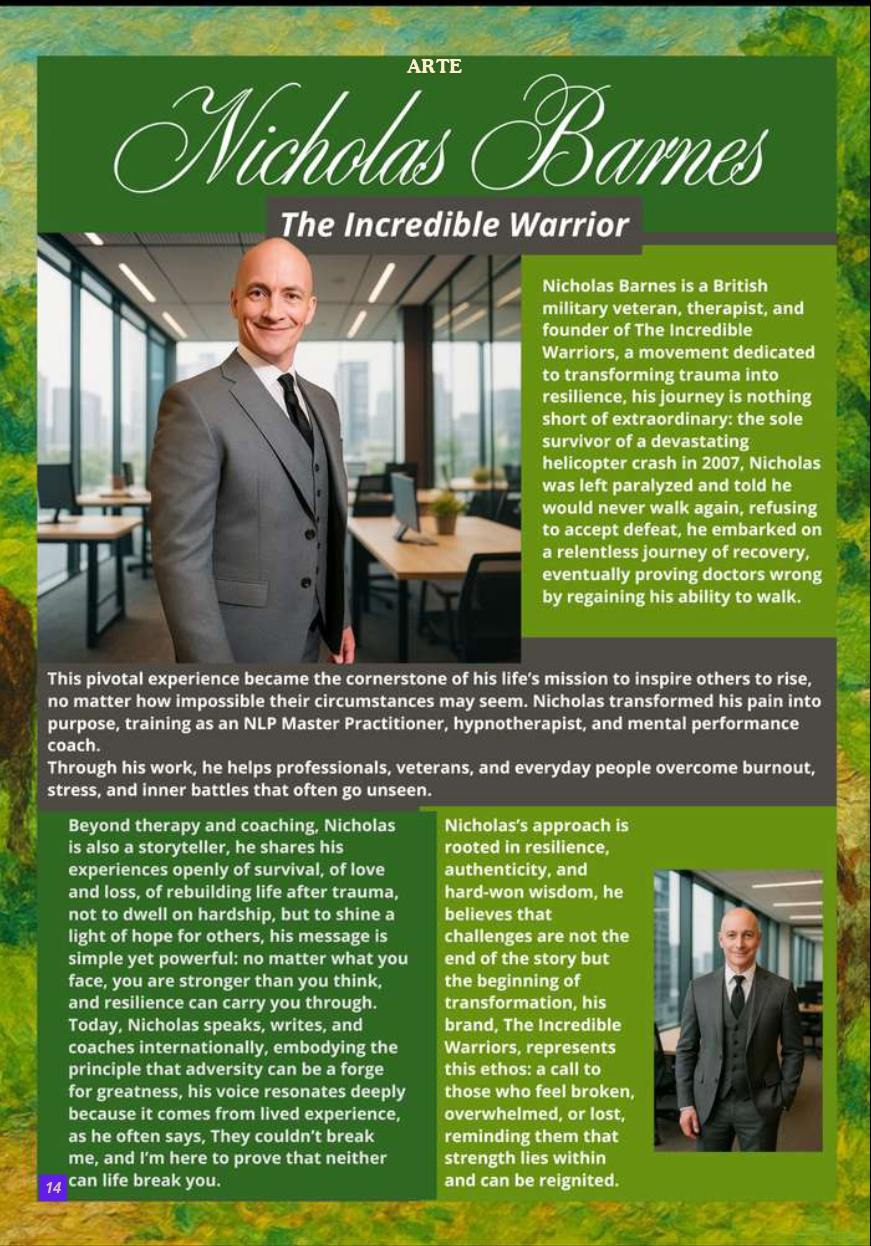 Nicholas Barnes is a British military veteran, therapist, and founder of The Incredible Warriors, a movement dedicated to transforming trauma into resilience, his journey is nothing short of extraordinary: the sole survivor of a devastating helicopter crash in 2007, Nicholas was left paralyzed and told he would never walk again, refusing to accept defeat, he embarked on a relentless journey of recovery, eventually proving doctors wrong by regaining his ability to walk.
